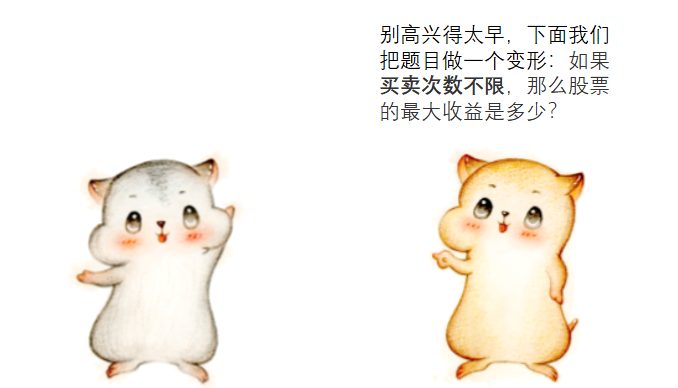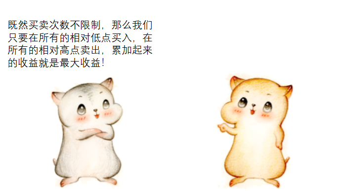 在图中,绿色的线段代表价格上涨的阶段。既然买卖次数不限,那么我们完全可以在每一次低点都进行买入,在每一次高点都进行卖出。