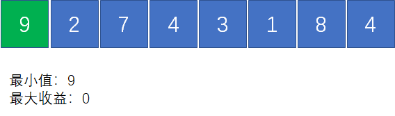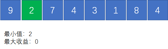 第2步,遍历到第2个元素,由于2<9,所以当前的最小价格变成了2;此时没有必要计算差值的必要(因为前面的元素比它大),当前的最大收益仍然是0: