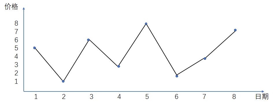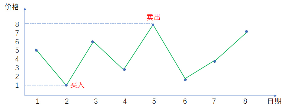 显然,从第2天价格为1的时候买入,从第5天价格为8的时候卖出,可以获得最大收益: