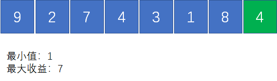 以此类推,我们一直遍历到数组末尾,此时的最小价格是1;最大收益是8-1=7: