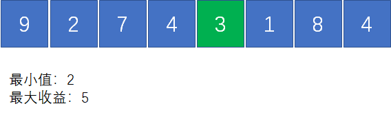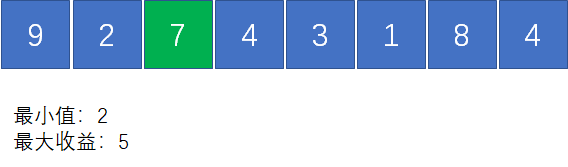 第3步,遍历到第3个元素,由于7>2,所以当前的最小价格仍然是2;如我们刚才所讲,假设价格7为卖出点,对应的最佳买入点是价格2,两者差值7-2=5,5>0,所以当前的最大收益变成了5:
