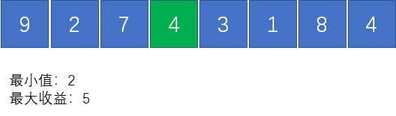 第4步,遍历到第4个元素,由于4>2,所以当前的最小价格仍然是2;4-2=2,2<5,所以当前的最大收益仍然是5:
