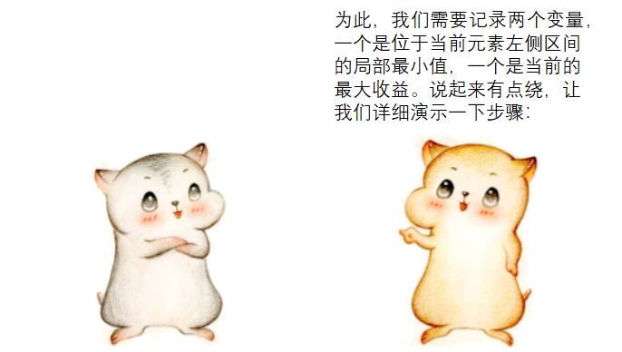 第1步,初始化操作,把数组的第1个元素当做临时的最小价格;最大收益的初始值是0: