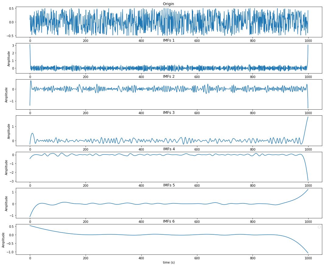 def sifting(data):index = list(range(len(data)))max_peaks = list(argrelextrema(data, np.greater)[0])min_peaks = list(argrelextrema(data, np.less)[0])ipo3_max = spi.splrep(max_peaks, data[max_peaks],k=3) #样本点导入,生成参数iy3_max = spi.splev(index, ipo3_max) #根据观测点和样条参数,生成插值ipo3_min = spi.splrep(min_peaks, data[min_peaks],k=3) #样本点导入,生成参数iy3_min = spi.splev(index, ipo3_min) #根据观测点和样条参数,生成插值iy3_mean = (iy3_max+iy3_min)/2return data-iy3_meandef hasPeaks(data):max_peaks = list(argrelextrema(data, np.greater)[0])min_peaks = list(argrelextrema(data, np.less)[0])if len(max_peaks)>3 and len(min_peaks)>3:return Trueelse:return False# 判断IMFsdef isIMFs(data):max_peaks = list(argrelextrema(data, np.greater)[0])min_peaks = list(argrelextrema(data, np.less)[0])if min(data[max_peaks]) < 0 or max(data[min_peaks])>0:return Falseelse:return Truedef getIMFs(data):while(not isIMFs(data)):data = sifting(data)return data# EMD函数def EMD(data):IMFs = []while hasPeaks(data):data_imf = getIMFs(data)data = data-data_imfIMFs.append(data_imf)return IMFs# 绘制对比图data = np.random.random(1000)-0.5IMFs = EMD(data)n = len(IMFs)+1# 原始信号plt.figure(figsize = (18,15))plt.subplot(n, 1, 1)plt.plot(data, label='Origin')plt.title("Origin ")# 若干条IMFs曲线for i in range(0,len(IMFs)):plt.subplot(n, 1, i+2)plt.plot(IMFs[i])plt.ylabel('Amplitude')plt.title("IMFs "+str(i+1))plt.legend()plt.xlabel('time (s)')plt.ylabel('Amplitude')