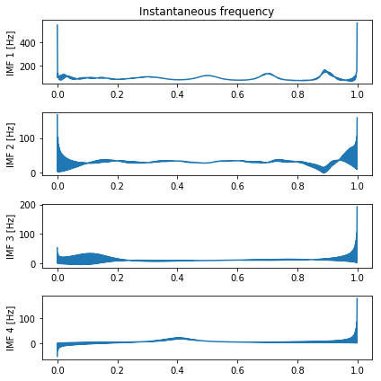 # 提取imfs和剩余emd = EMD()emd.emd(S)imfs, res = emd.get_imfs_and_residue()# 绘制 IMFvis = Visualisation()vis.plot_imfs(imfs=imfs, residue=res, t=t, include_residue=True)# 绘制并显示所有提供的IMF的瞬时频率vis.plot_instant_freq(t, imfs=imfs)vis.show()