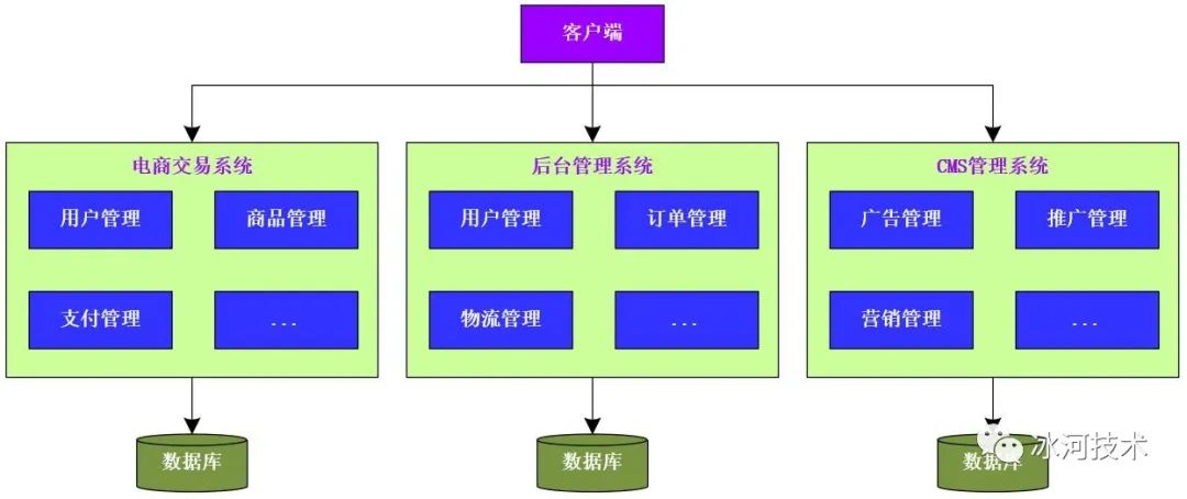 这里,我们同样以电商系统为例,在垂直应用架构下,我们可以将整个电商项目拆分为:电商交易系统、后台管理系统、CMS管理系统等。