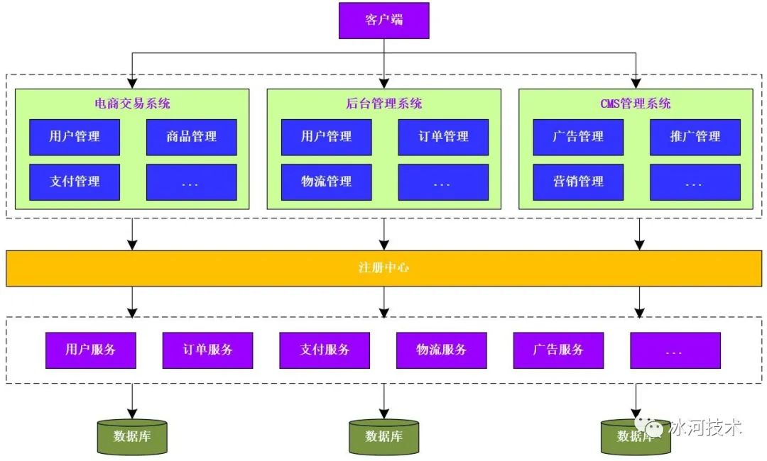 随着业务的发展,我们在SOA架构的基础上进一步扩展,将其彻底拆分为微服务架构。在微服务架构下,我们将一个大的项目拆分为一个个小的可以独立部署的微服务,每个微服务都有自己的数据库。