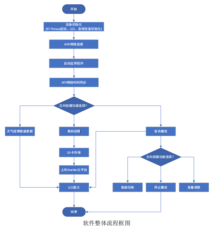 本设计在此基础上主要实现了以下功能,包括天气和疫情数据更新显示、MP3 音乐播放器以及数码拍照相机的功能。其中 MP3 播放器具有音量调节,播放/停止控制和歌曲切换的功能;数码相机将拍照图片进行 LCD 屏显示,同 时具有 SD 卡存储和 OneNet 云平台存储功能。该产品可以充当家庭数码助理的角色,因此取名“数码小精灵”。同时本作品完成的过程中参考了部分网络资料和网友的思路,在此一并表示感谢。