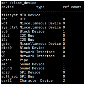 在 RT-Thread 系统上的设备注册列表,其中主要使用了 rtc,sd0,w0,sound,uart1 等设备。使用到的 RT-Thread 组件包括了 FinSH 控制台,虚拟文件系统,POSIX 接口。在软件包上面涉及到网络工具及 NetUtils,WebClient,cJSON,EasyFlash,rt_ota,TJpgDec,Player 等。