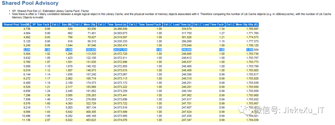 AIX 操作系统内存 64G,数据库内存 38.25G,将其调整为 30G,PGA 调整为 14G,shared_pool 5G,db_cache 15G,large_pool 1G,java_pool 128G,streams_pool 256M。这些值都是一个近似的值,一个较为合理的值,并不保证 100% 完美正确,在 AWR 报告中 Advisory Statistics 部分,也会有相关的建议值,如下便是一个较为合理的 shared_pool 的值。设置完这些值后重启数据库系统,将会有一个很大的提升。