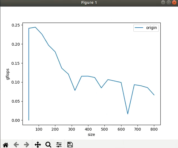 从这张图可以看到,在矩阵长宽取100的时候可以达到最高的gflops大概是0.25gflops,相对硬件的理论浮点峰值只有2-3%,所以此算法的优化空间还是非常巨大的,接下来我们就可以使用如减少乘法次数,内存对齐,分块等策略去改进这个算法获得更好的gflops。这样,我们在算法优化的过程中就可以更加直观的看到算法的性能。