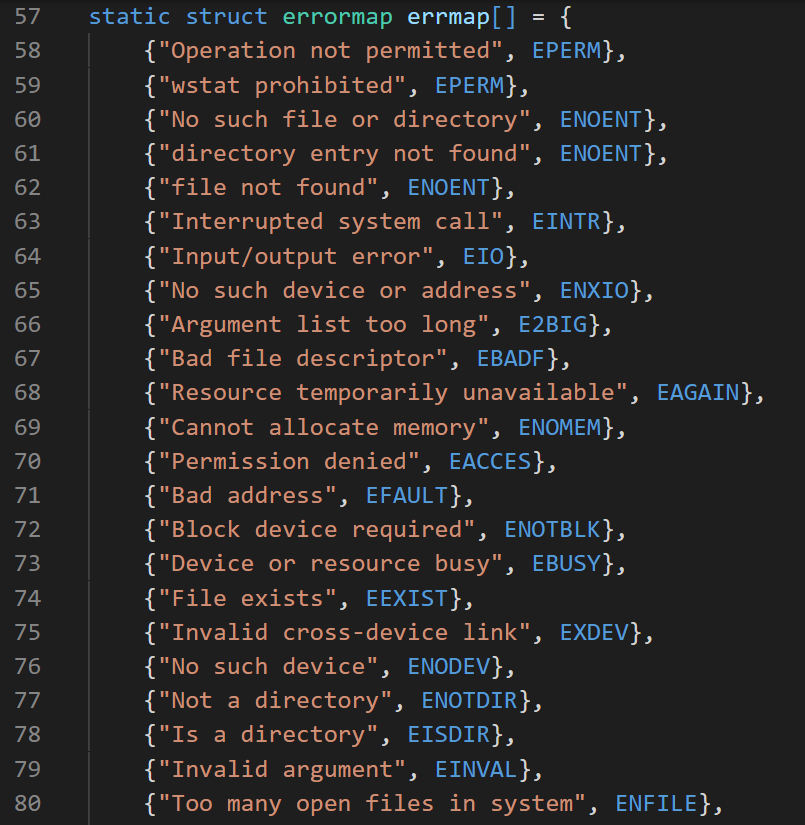 这些错误代码后面有一些描述注释,这些描述也不仅仅是作为注释使用,也有与这些错误代码建立一一对应的字符串输出关系,比如: