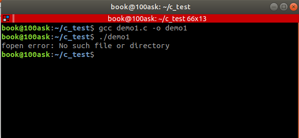 此时,我们本地的/home/book/路径下并没有test_file文件,编译运行就会输出错误信息: