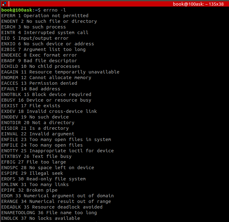 使用errno -l命令查看系统错误代码及描述: