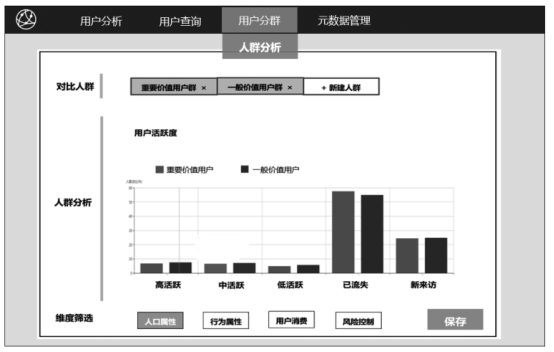 创建好目标用户群体后,在“对比维度”选择菜单中选择需要分析该批用户的维度(如图11所示),例如这里选择的是下单次数和活跃度。“对比维度”列表中的可选标签也是用户属性、用户行为栏目中已经构建的标签。