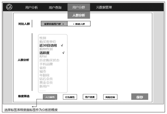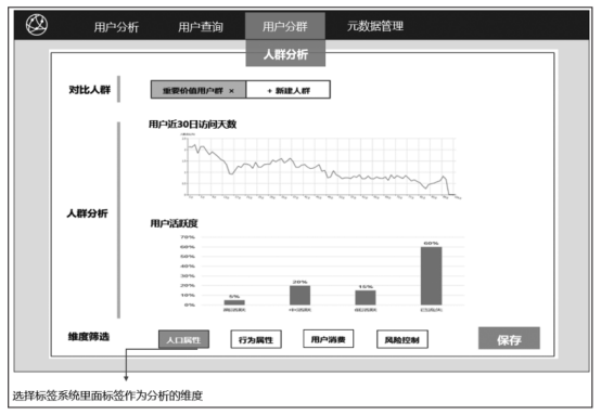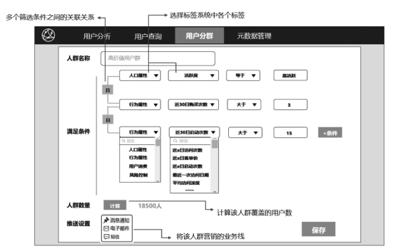 下面介绍人群分析功能和产品形态。首先和用户分群功能一样,需要组合标签筛选出目标用户群体(如图10所示)。