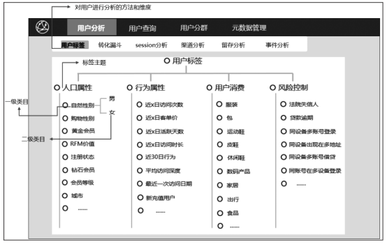 在标签视图板块中,层级化地展示了目前已经上线使用的全部用户标签。用户可以层级化地通过点击标签,查看每个标签的详细介绍。