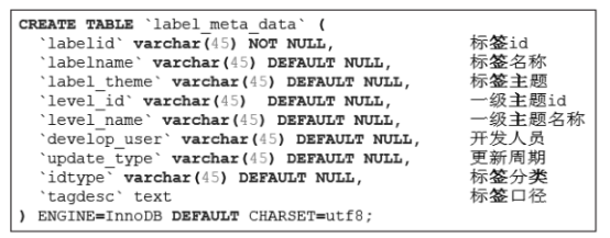 可在该页面中编辑标签相关的元数据,包括标签id、名称、开发人员、标签类型、标签描述、数据源等,方便业务人员在应用时理解该标签的业务意义以及其负责人员。对应的元数据信息维护在关系型数据库中,需要创建一些关键字段,如图6所示。通过Navicat等图形化操作界面可查看录入的元数据信息,如图7所示。