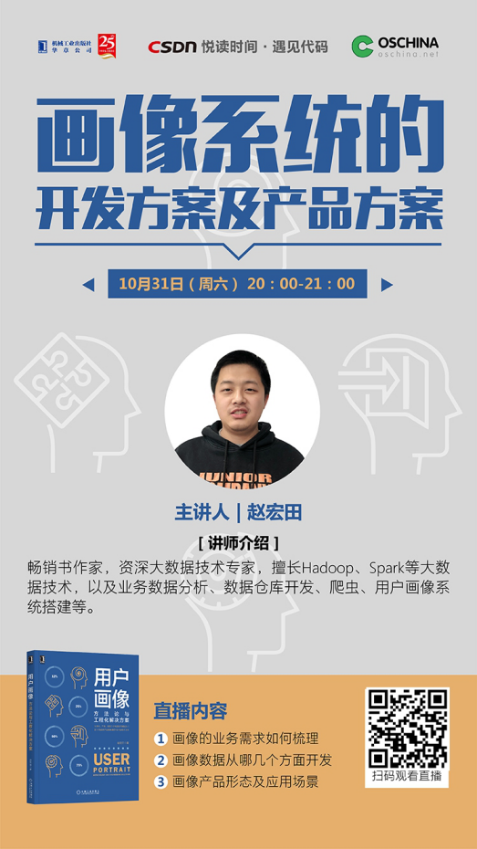 赵宏田老师将于 10 月 31 日晚 20 点,与大家分享“画像系统的开发方案及产品方案”,欢迎大家扫码准时观看。