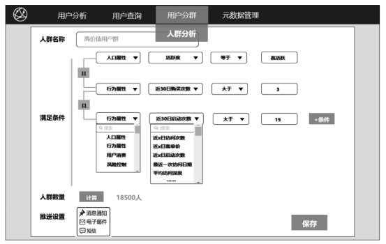用户分群功能主要是面向业务人员使用。产品经理、运营、客服等业务人员在应用标签时,可能不仅仅只查看某一个标签对应的人群情况,更多地可能需要组合多个标签来满足其在业务上对人群的定义。例如:组合“近30日购买次数”大于3次和“高活跃”“女性”用户这3个标签定义目标人群,查看该类人群覆盖的用户量,以及该部分人群的各维度特征。下面介绍产品上的实现方式。