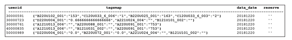 Hive存储的相关标签表,包括userid和cookieid两个维度。