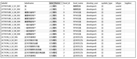 - dw.userprofile_usergroup_labels_all:用户人群分组表。查询应用到业务系统下面,对应人群id里面的用户数据,在营销效果测试中有广泛应用。例如业务人员针对圈定的某人群进行短信营销,数据分析师在分析营销效果时,可以查询这张表中该人群id下面的用户id数据,进一步分析这批用户在后续的活跃和订单方面的表现。