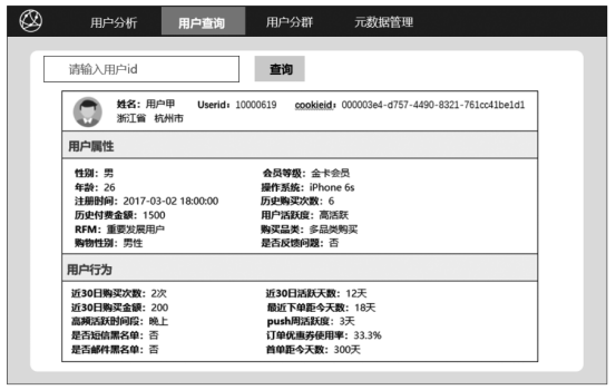 在标签查询模块中,如图3所示,通过输入用户对应的userid或cookieid,可以查看该用户的属性信息、行为信息、风控属性等多个维度的信息,多方位了解一个用户的特征。关于如何存储这种数据结构,在3.1.3节中有介绍,即通过将每个用户对应的标签聚合成map字段格式,如{‘key1’:‘value1’,‘key2’:‘value2’},进行存储。