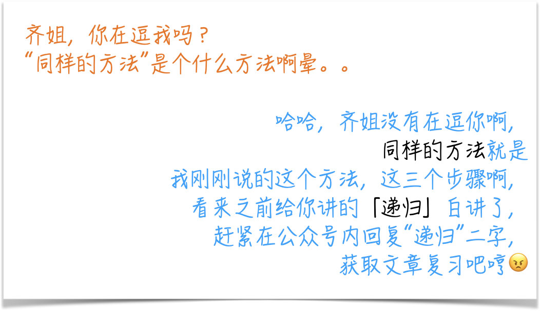 当然了,虽然左右两边的拆分我都叫它 Step2,但是它们并不是同时发生的,我在递归那篇文章里有说原因,本质上是由冯诺伊曼体系造成的,一个 CPU 在某一时间只能处理一件事,但我之所以都写成 Step2,是因为它们发生在同一层 call stack,这里就不在 IDE 里演示了,不明白的同学还是去看递归那篇文章里的演示吧。