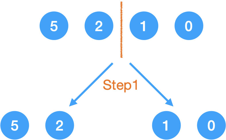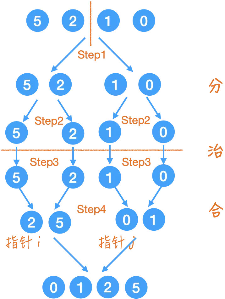 这里需要借助两个指针和额外的空间,然后左边画一个彩虹 🌈 右边画个龙 🐲,不是,是左边拿一个数,右边拿一个数,两个比较大小之后排好序放回到数组里(至于放回原数组还是新数组稍后再说)。