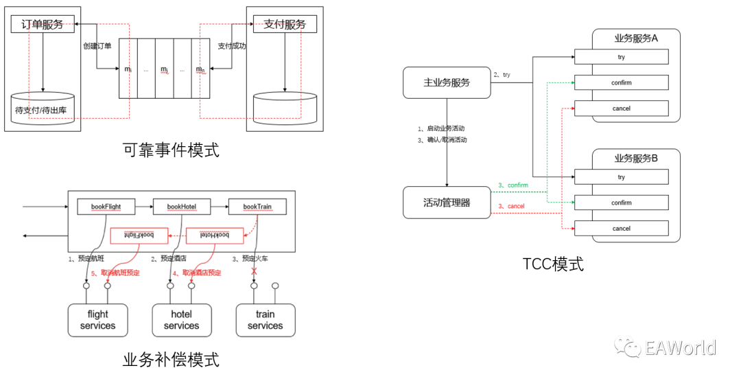 1) 都要求服务提供者在正常的交易之外,提供额外的功能,貌似带来了代码的复杂度,加大了工作量。实际上都是业务需求中必备的,例如:TCC 模式在交易系统中都有预扣款这样的接口,并不会增加实现的工作量。而对于服务的调用者来说,相关服务的调用由微服务框架实现,例如自动的事件投放、自动补偿调用、TCC中 CC 服务的调用,也不需要额外的工作量;