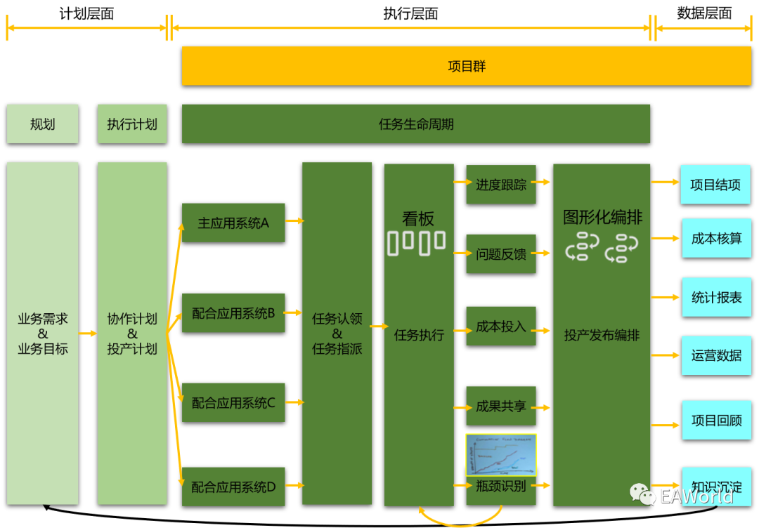 项目群视角: 项目群是金融科技管理过程中一个很具特色的项目协同管理方式。在金融企业中,通常单一业务需求或合并后的业务需求会触发多个系统的配合改造来满足,这就出现了一个主项目、多个配合项目协同开发、协同投产的情况。