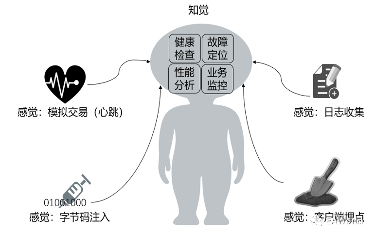3) 字节码注入:注入到服务端代码中,用于感觉后端服务的运行情况。