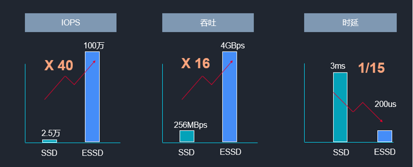 从图上可以看出 ESSD 相对普通 SSD 的性能提升:ESSD IOPS 单盘高达 100w,相比上一代提升 40 倍;吞吐性能达到 4GBps,提升 16 倍;时延低至 0.2ms(即 200us),为前代 SSD 时延的 1/15。