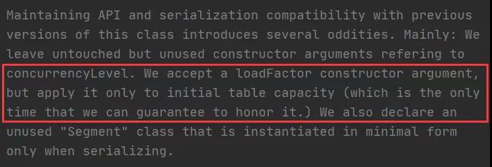 至于为什么要这么做?为什么要和HashMap的实现有所差异?我觉得是因为要淡化自定义负载因子的功能。如果细心的话可以看到,在ConcurrentHashMap的源码中,this.loadFactor的使用几乎没有(仅有的一次使用也是遗留代码),似乎Doug Lea已经不建议我们来自己修改负载因子的值了。虽然仍然可以在构造器阶段传入自定义的loadFactor(向后兼容),但是也仅仅是在该构造器内部中才会有所影响,在后续的初始化以及扩容阶段使用的还是默认的0.75(后面会看到这点),所以说如果传入的自定义负载因子不是0.75的话就显得很鸡肋了。在源码中对此也有所注释: