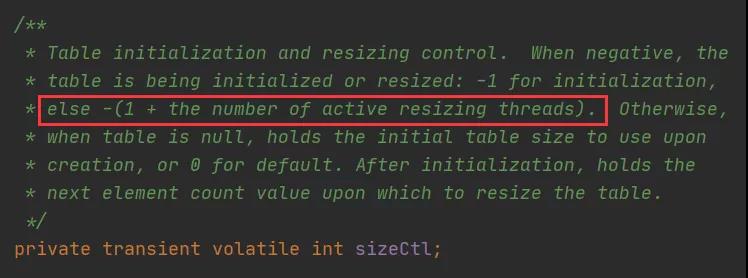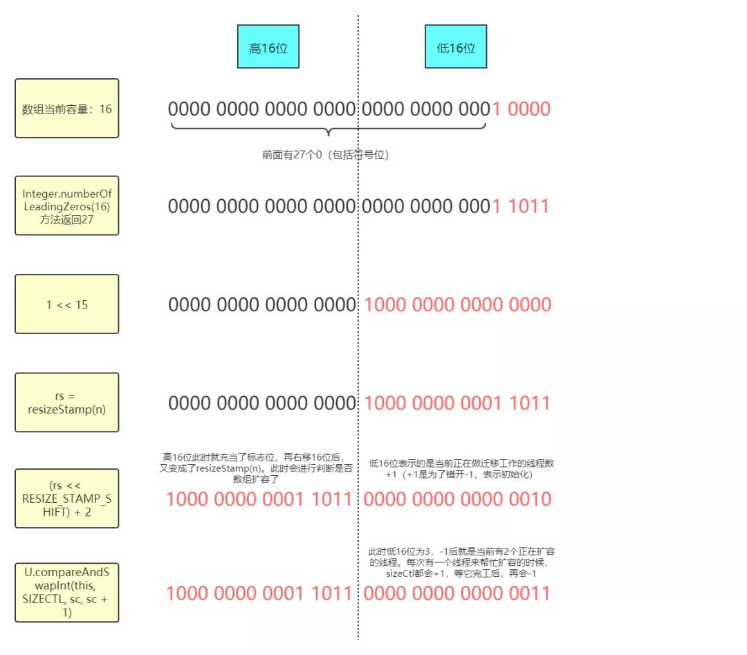 还有一点需要明确:sizeCtl在为负数表示扩容的时候(不包括-1),严格的定义为取该负数的低16位,即(1 + n),n代表正在执行扩容操作的线程数量(这里+1是为了错开-1这个值)。低16位表示的才是扩容线程数量+1,而高16位为一个生成数组长度所对应的标志位(详见后面的示意图)。而在源码中的注释是这样写的: