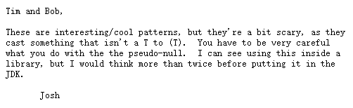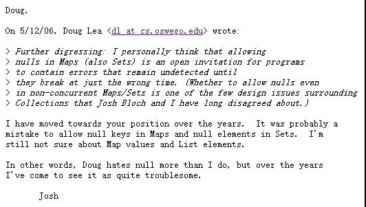 他也只是解释了value不能为null的原因(就如同上面我说的那样),但是在倒数第二段中,他说到了一点就是检查key和value是null,这个是很困难的。其实看完他说的这段话,我有理由相信,key不能为null就是Doug Lea提前设定好的代码规范(既然你value已经不能为null了,key也别为null了),以此来避免没必要出现的麻烦(二义性或其他)。上面还说到了Doug Lea认为HashMap中的key和value也不能为null,同时给出了一种在多线程使用HashMap时,用一种包装NULL为空对象的方式,以此来区分出这两种差异(用Java 8中的Optional类应该也能做到)。有意思的是,这和Josh Bloch(另一位Java界大佬,HashMap的主要作者之一(Doug Lea也是)。可以认为HashMap主要是Josh Bloch写的,而ConcurrentHashMap是Doug Lea写的)之前的想法是相左的,但是后来,Josh Bloch似乎改口了: