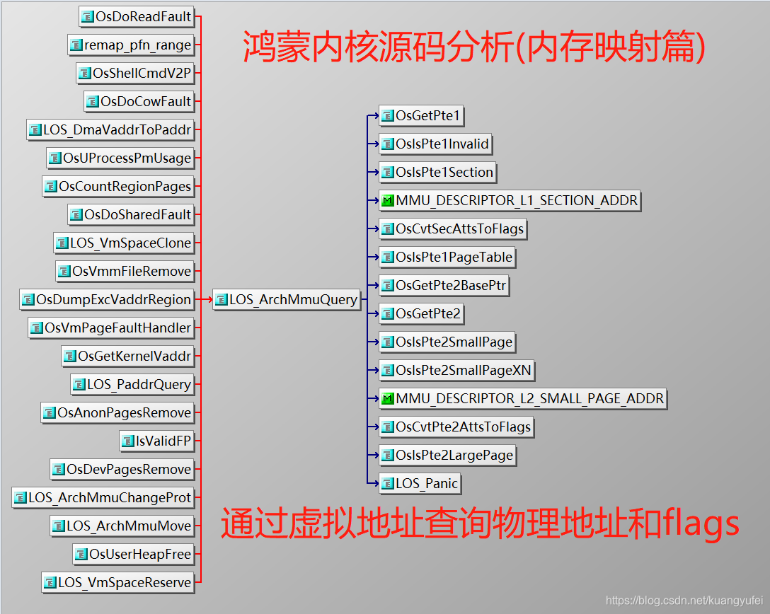 这是鸿蒙内核对地址使用最频繁的功能,通过虚拟地址得到物理地址和flag信息,看下哪些地方会调用到它。