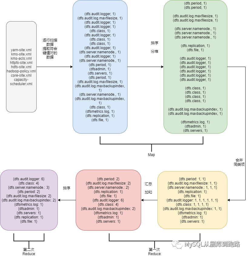 稍有不同的是这里有两次reduce,第二次reduce就是把结果按照出现次数排个序。map和reduce流程开发者自己随意组合,只要各流程的输入输出能衔接上就行。