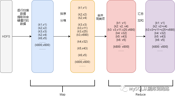 原理是大任务先分堆处理-Map,再汇总处理结果-Reduce。分和汇是多台服务器并行进行,才能体现集群的威力。难度在于如何把任务拆解成符合MapReduce模型的分和汇,以及中间过程的输入输出<k,v> 都是什么。