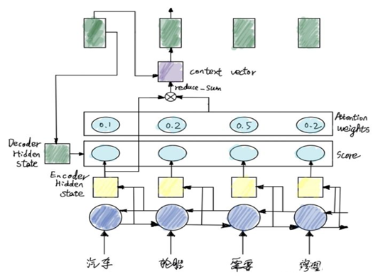解码器是在 Decoder 中输入一个 <START> 标记,用于预测第一个词,从第二个词开始,用前一个词来预测下一个词。在训练阶段这也称为 Teacher Forcing。有了编码阶段输入序列的隐状态序列,以及解码阶段第n步的隐状态,可以计算注意力权重。