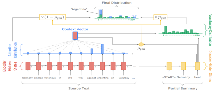 基于 seq2seq+ 注意力机制的改进模型,目前效果最显著的就是指针网络,它是由 google 在 2018 年提出的,结合了抽取式和生成式两方的有点,通过从原文中复制词语,可以再现原文的重要细节,并保留了生成文本的能力,可以生成原文中没有的词语;此外,通过运用 Coverage 机制,对已经出现在摘要中的词语,降低其注意力权重,从而降低其再次被生成的概率,在一定程度上也解决了重复生成的问题。典型的指针网络架构如下图所示: