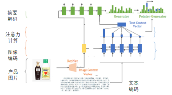 我们在这里采用基于 seq2seq+ 注意力机制的改进模型作为 baseline,参照方式 3,引入扶贫商品的图片信息参与摘要抽取模型的训练。对图片信息通过 RESNET101 网络作为视觉特征编码器,并采用 Pooling5 层输出信息作为视觉特征,并使用视觉特征参与到模型解码器的参数初始化处理过程,原来也考虑过使用多模态的预训练模型作为特征提取器,但考虑到技术栈不熟悉以及迁移学习资源开销可能比较大,所以暂未采用。