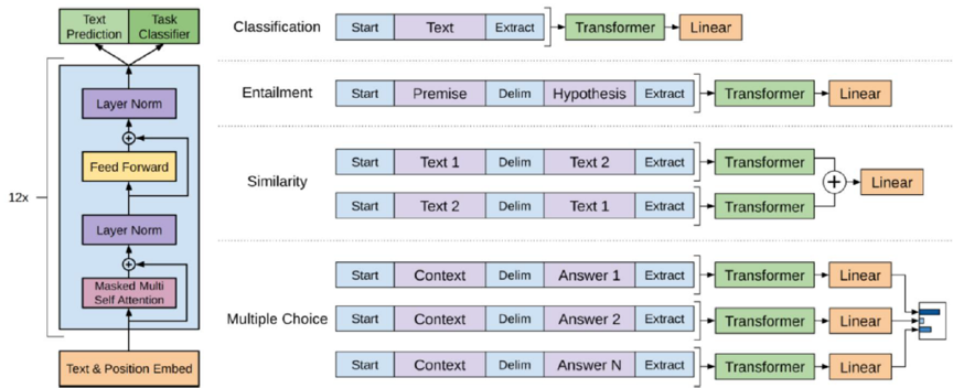 上图所示是 GPT 模型架构,它只使用了解码器部分(Masked Self-Attention)。国内在中文版 GPT2 基础上实现了摘要抽取。其主要思路是基于多轮会话模型的训练过程进行改造,将多轮会话训练语料中的问题|答案对改为原文|摘要对训练语料。GPT2 模型的一个特点是针对每个下游任务微调的模型并不通用,换一个领域进行处理,仍旧需要进行单独的微调,这对于生成式文本摘要任务也一样,而且由于 GPT2 LARGE 模型 15 亿参数的体积,这个对算力要求是比较大的。