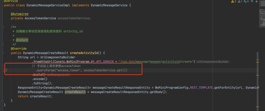 1.在每个调用微信小程序接口的地方,都加上accessToken参数,由于该参数又依赖于AccessTokenService,所以又需要先注入AccessTokenService,比较繁琐。且,2.如果固定的请求参数不止一个而有很多个,3.且来源比较复杂,将极大地增加开发的繁琐程度。且,4.如果后续参数有调整,有增减,那散落在各处的请求地址,每个都需要改,想想都可怕😨。