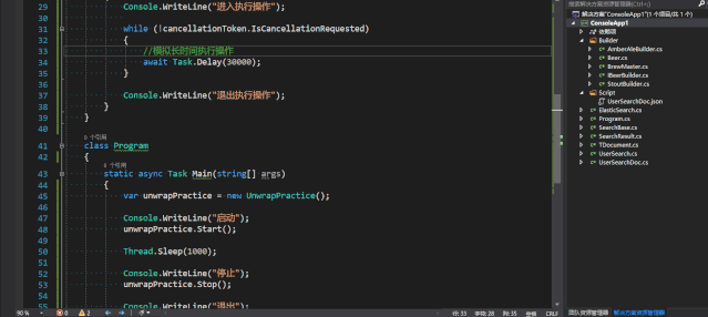 反观上述动态图,此时我们将发现长时间异步任务通过调用取消令牌根本没有停止(在控制台并没有打印出【退出执行操作】字眼),此时我们可利用Unwrap方法创建此任务代理,然后在调用令牌取消方法后,再执行代理的等待方法,等待取消任务直至完成即可,貌似有点Thread中Join方法的意味,如下: