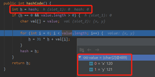 第二次循环:h=x,val[1]=y,所以 h=31*x+y。