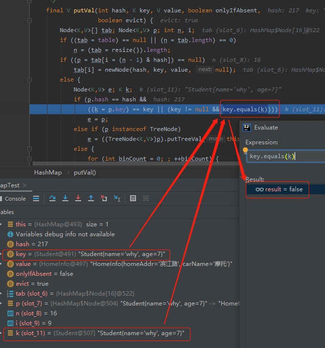 HashMap put 方法执行的时候,用的是 equals方法判断当前 key 是否与表中存在的 key 相同。
