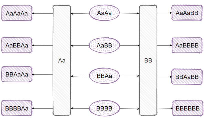 有了这 4 个字符串,我们再去和 Aa,BB 进行组合,比如 AaBBAa,BBAaBB......