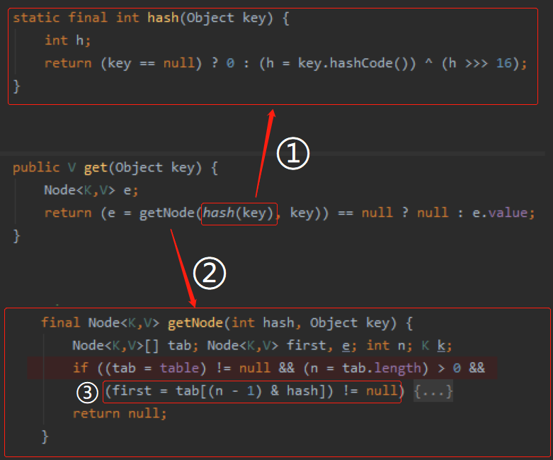 因此,标号为 ③ 的地方,经过 hash 计算后得出的 tab 数组下标,对应的位置为 null。不会进入 if 判断,这里返回为 null。