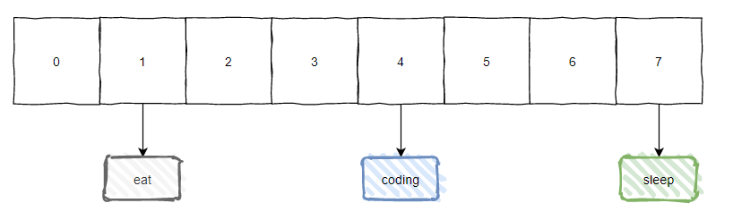 但是如图所示,下标为 1 的地方已经挂了一个 eat 的值了。这个坑位已经被人占着了。